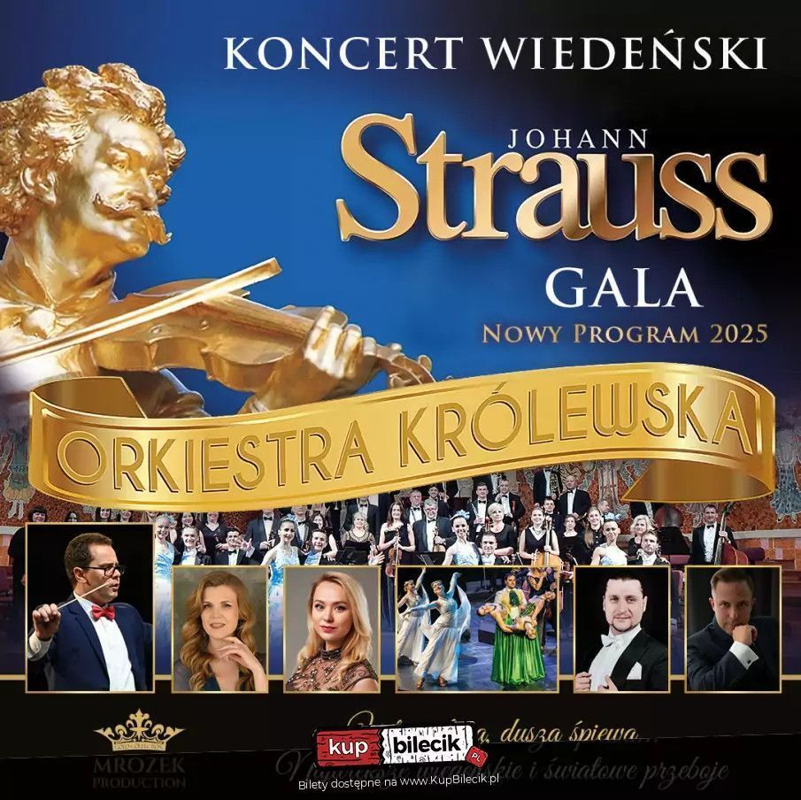 Zapraszamy Państwa w podróż do roztańczonego i magicznego Wiednia, gdzie będą rozbrzmiewać najpiękniejsze arie, duety, walce i polki Johanna Straussa, Franca Lehara, Imre Kalmana. Tegoroczny koncert w wykonaniu światowej Królewskiej Orkiestry pod dyrekcją znakomitego dyrygenta Romana Dzundzy - wieloletniego dyrygenta symfoniczno - operowego i dyrektora artystycznego Filharmonii w Ivano-Frankivsku. Artysta pełni funkcję zastępcy dyrektora artystycznego międzynarodowego projektu Ukrainian Art Song Project, jest ekspertem Ukraińskiego Funduszu Kultury oraz laureatem nagrody im. M. Pidhirianki, co świadczy o wysokiej ocenie jego wkładu w sferę życia kultury. Orkiestrze towarzyszyć będą europejskiej klasy soliści międzynarodowych scen. Wśród solistów usłyszą Państwo wyjątkową - unikalną sopranistkę Wiktorię Melnik, Studiowała śpiew operowy w Narodowej Akademii Muzycznej w Kijowie. Zadebiutowała partią Mikaeli w operze "Carmen" na scenie Lwowskiej Opery Narodowej. Wykonała tytułową rolę w operze "La Traviata" w Operze w Burgas w Bułgarii. Artystka jest laureatem i zdobywcą specjalnych nagród wykonawczych w konkursach wokalnych na Ukrainie, w Polsce, Włoszech, Niemczech, Chorwacji i Bułgarii. Katarzyna Czekanowska - sopran. Artystka jest laureatką międzynarodowych i krajowych konkursów wokalnych, m.in. Grand Prix im. S Kruszelnickiej oraz zdobywczynią pierwszej nagrody w międzynarodowym konkursie wokalnym w Cambridge 2023/Anglia. Solistka koncertuje w Polsce, Francji, Niemczech, Austrii, Belgii. Aleksander Kruczek tenor to ulubieniec publiczności i jeden z najlepszych polskich tenorów młodego pokolenia. Tenor obdarzony wyjątkową barwą głosu. Jest laureatem wielu międzynarodowych konkursów wokalnych. Solista Aleksander Kruczek to polski tenor. Ukończył Akademię Muzyczną w Katowicach i Studium Wokalno-Baletowe przy Teatrze Muzycznym w Gliwicach. Brał udział w programie kształcenia młodych talentów w Operze Narodowej. W Teatrze Muzycznym w Gliwicach występował w operetkach, takich jak "Orfeusz w piekle", "Carmen", "Noc w Wenecji", "Hrabina Marica" i "Wesoła wdówka". Współpracował z teatrami operowymi w Łodzi, Warszawie i Poznaniu. Brał udział w festiwalach muzycznych, m.in. w Festiwalu "Gloria", Śląskim Festiwalu im. Beethovena, Festiwalu "Ave Maria", Festiwalu Muzyki Wiedeńskiej i Letnim Festiwalu Muzycznym w Krynicy-Zdroju. Jest laureatem konkursów wokalnych. Koncertował w Belgii, Niemczech, Hollandii, Polsce, Luksemburgu, Włoszech i Francji. Yuri Hryhorasz - baryton, śpiewak operowy i musicalowy, absolwent Narodowej Akademii Muzycznej we Lwowie. Członek grupy a cappella "LaVIVo". Artysta jest gościnnym solistą Lwowskiej Opery Narodowej i Lwowskiej Filharmonii Narodowej oraz solistą Opery Wrocławskiej. Brał udział w wielu międzynarodowych projektach w wielu krajach na całym świecie: Niemcy, Szwajcaria, Hiszpania, Kanada, Stany Zjednoczony, Chiny, Hongkong. Wokalista współpracował na jednej scenie z takimi gwiazdami jak: Dennis Adu, Dirty Loops, Frank London, Anthony Strong i wieloma innymi. Artyści przeniosą słuchaczy do ojczyzny walca prezentując niezwykły kunszt wokalny i instrumentalny. Ta niezwykła gala będzie wzbogacona wirtuozerskim tańcem par tanecznych, barwnymi kreacjami i bogatą choreografią, co pozwoli na doświadczenie wielu doznań artystycznych w iście książęcym stylu. Pary taneczne to soliści Narodowego Teatru Opery i Baletu we Lwowie. W ten magiczny wieczór zabrzmią największe przeboje Króla walca Johanna Straussa takie jak uwertura z Zemsty Nietoperza, Keiser Marsz, Marsz Radezki, walc "Nad pięknym modrym Dunajem", "Wiedeńska krew", czy "Odgłosy wiosny" a także polki Trich Trasch, Eljen Magiar Polka, Anne Polka, Gromy i Błyskawice i wiele innych orkiestrowych szlagierów. Nie zabraknie także popisowych arii i duetów z najsłynniejszych operetek: Zemsty Nietoperza, Barona Cygańskiego, Księżniczki Czardasza, Hrabiny Maricy, Wesołej Wdówki czy Krainy Uśmiechu. Publiczność wysłucha między innymi: arie "Adeli", "Czardasz Sylvi", kuplety Barinkaya "Wielka sława to żart", "Graj Cyganie", " Artystki z Variete", "Brunetki Blondynki" a także duety wszechczasów, m.in. "Usta milczą dusza śpiewa", "Jakże mam Ci wytłumaczyć", " Jedź do Verasdin", " Co się dzieje oszaleję", "W rytm walczyka". Nie zabraknie także sztandarowych pieśni neapolitańskich takich jak: "O sole mio", "Funikuli-Funikula", "O Surdato N"namurato" oraz wiele innych muzycznych niespodzianek.